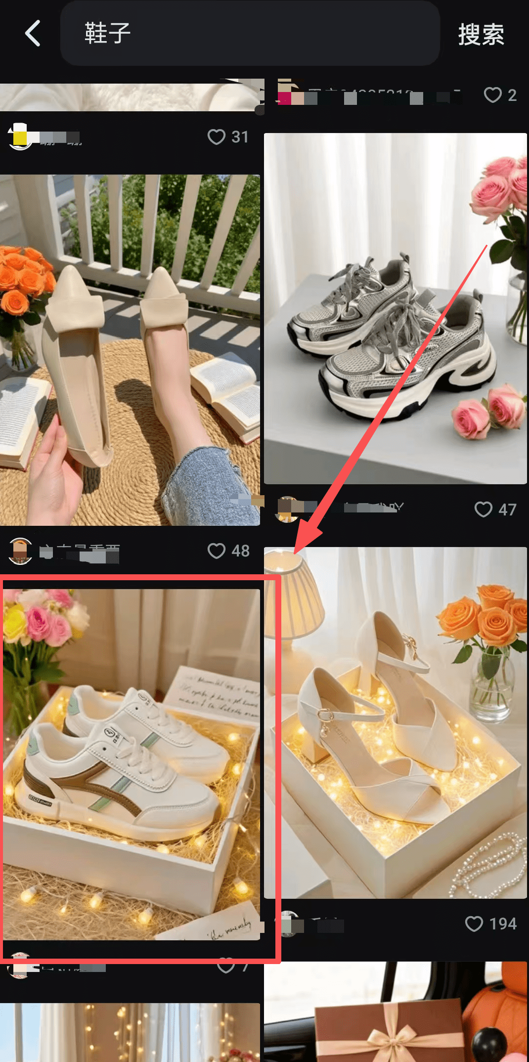 也非常简单,手机安装一个即梦app,然后搜索鞋子,就可以找到和上面图片里类似的图片,如下图所示: