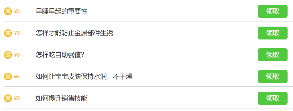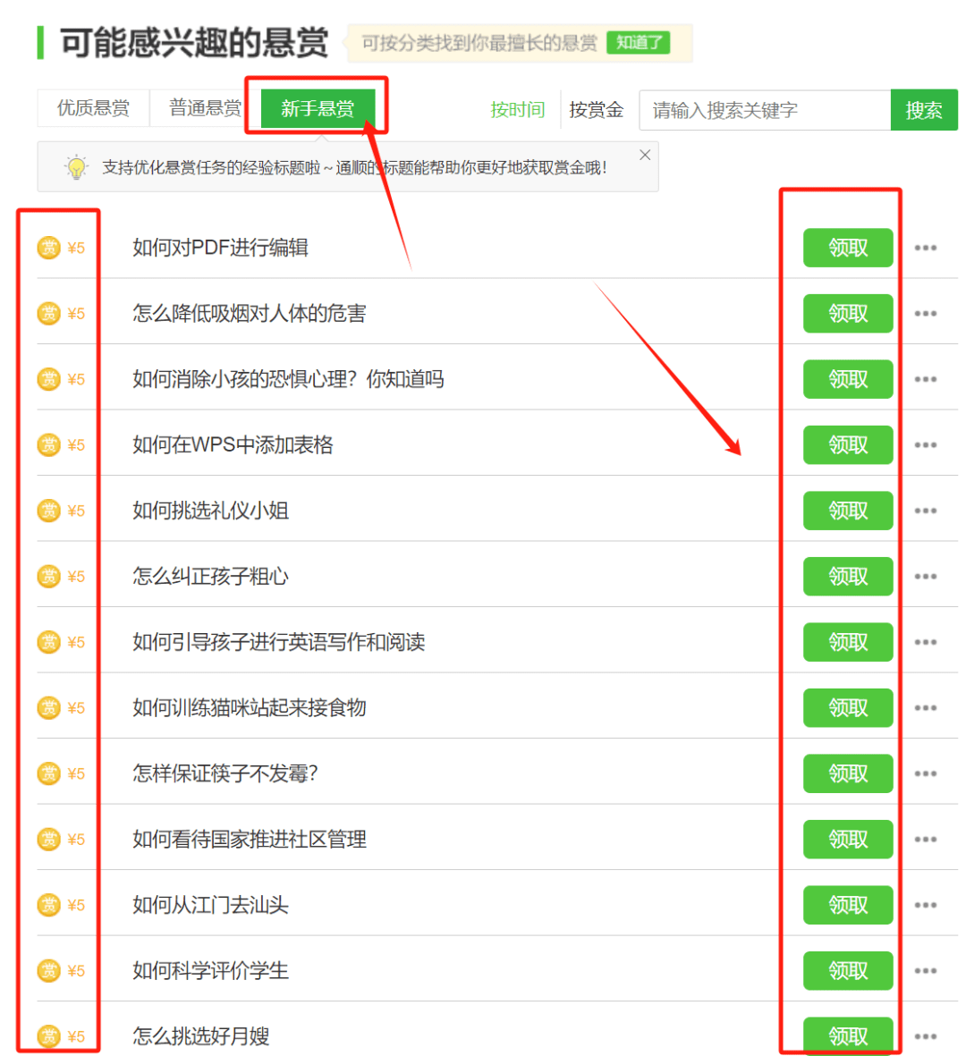 新手悬赏:单价5块,题目很多,随时都可以领取题目去回答