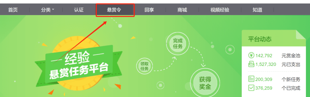 进到百度经验首页,可以看到有一个悬赏令
