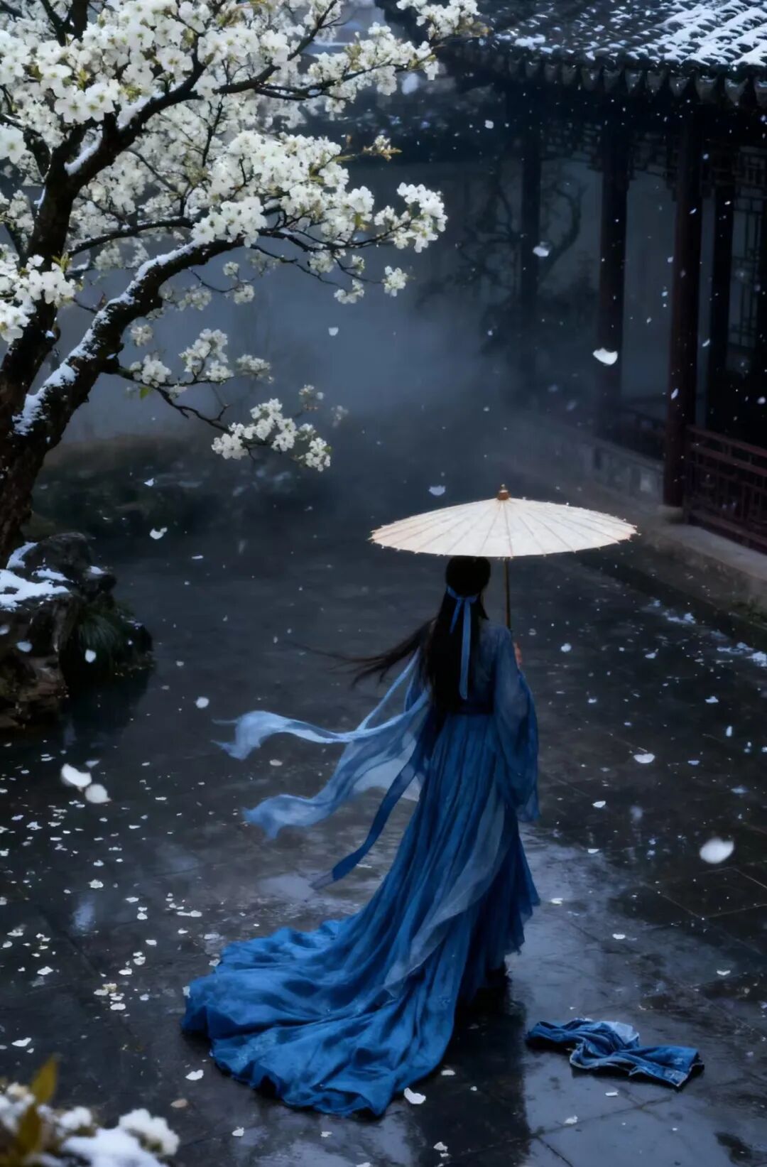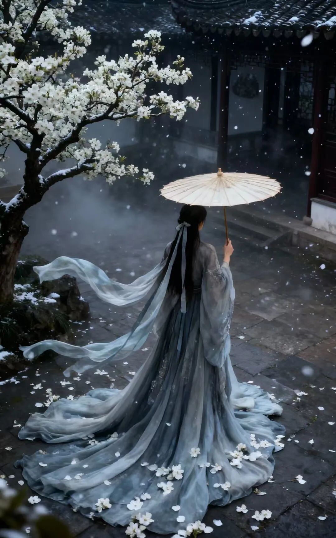 这张图片的核心内容是:在飘雪、起雾的江南古代园林庭yuan中,一位身着飘逸古风裙撑着油纸伞的女子背对镜头而立,周围梨花树的花瓣随风飘落,整体画面充满清冷、诗意的古风离愁意境。