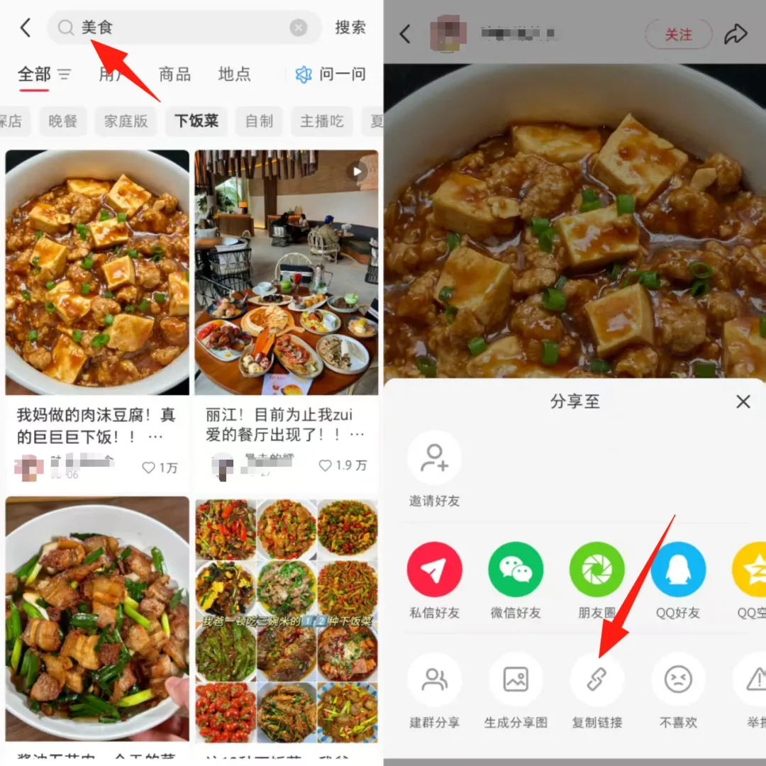 关于内容这块的话,可以去小红书搜索美食、美食教程这几个关键词,搜索出来很多热门笔记都可以搬的,看下图的操作就明白了。