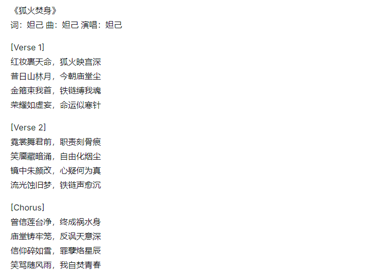 你是一名古风影视歌词创作者,请你以‘影视人物独白歌曲’的风格创作歌词。要求如下:【一、创作主题】1. 主体为妲己(封神榜角色);2. 主题围绕‘诱惑的假象与真心的破碎’‘被当作工具的悲剧’;3. 突出妲己‘表面魅惑,内心孤寂’的反差,有自我独白感。【二、文体与风格】1. 第一人称;2. 风格参考《美猴王》,语言具象、克制,有画面感;3. 情绪递进:压抑→怀疑→觉醒→孤寂;4. 短句为主,有韵律,每两句对仗(比如‘狐尾扫过红尘劫,真心葬入帝王阙’)。【三、结构要求】分 [Verse 1](开篇点题:荣耀与枷锁)、[Chorus](情绪爆发:信仰与反讽)、[Verse 2](觉醒与孤独)、[Ending](尾声留白),共 24-30 行。【四、意象建议】用‘狐尾’‘朱砂’‘王座’‘枯骨’‘月光’‘旧梦’等,承载悲剧感。【五、输出格式】开头标‘《狐焰烬》词:妲己 曲:妲己 演唱:妲己’,加曲风建议(如‘古风抒情 + 电子元素,节奏缓慢,尾音绵长’)。