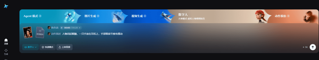 输入动作提示词,例如:人物闭起眼睛,一只手放在耳机上,手部跟着节奏摆动。