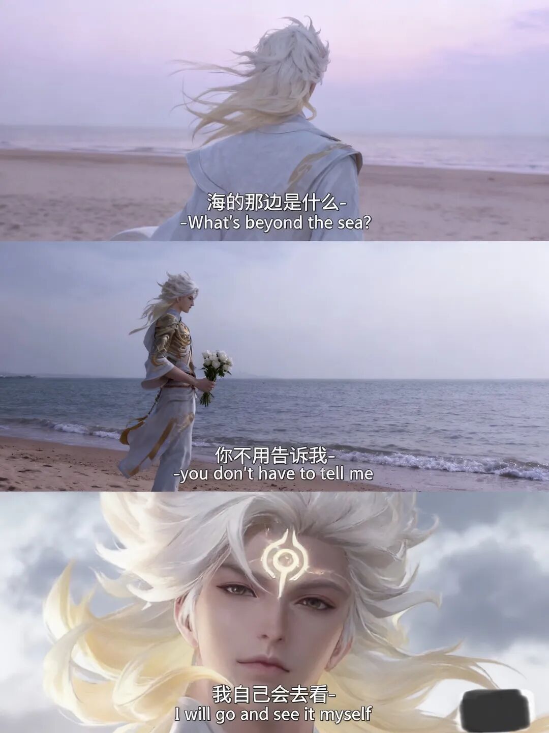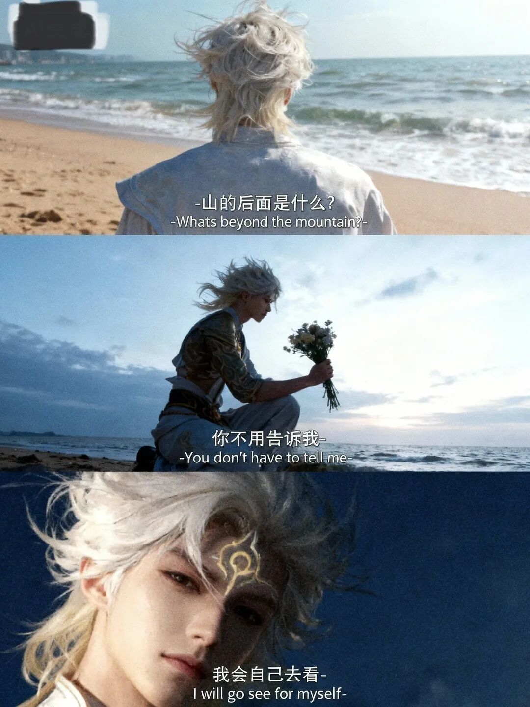 这张图片的核心内容是:以黄昏与清晨交织的海滨为背景,通过“山的后面是什么?你不用告诉我,我会自己去看”的文字递进,搭配人物在海边不同姿态的画面——或背影望向远方、或手持花束驻足、或特写坚定神情,将独立探索的态度与海滨的清新氛围感融合,用画面与文字的呼应,传递出一种不被定义、亲自奔赴未知的青春力量,打造出极具故事感与治愈感的视觉表达。