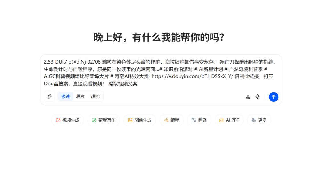 实战教程1.文案生成文案生成常用kimi、deepseek、claude、chatgpt或者豆包等等工具进行生成,这边我主要是为了方便我做案例,因此才选择豆包。相信很多人看到对标视频,觉得整个效果特别好,但是不知道怎么写提示词,那就先从最简单的方式开始,提取对标视频的链接发送给豆包