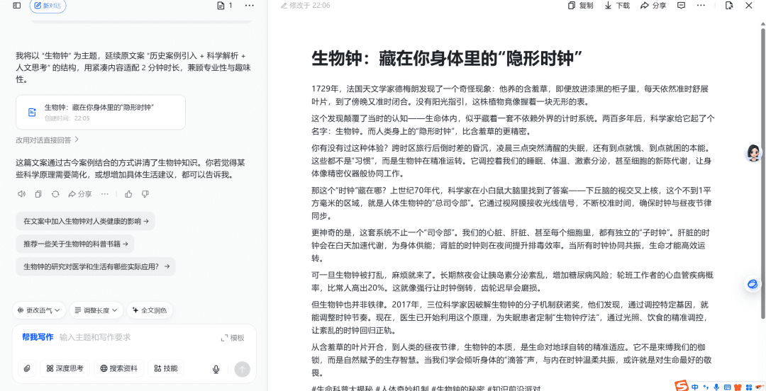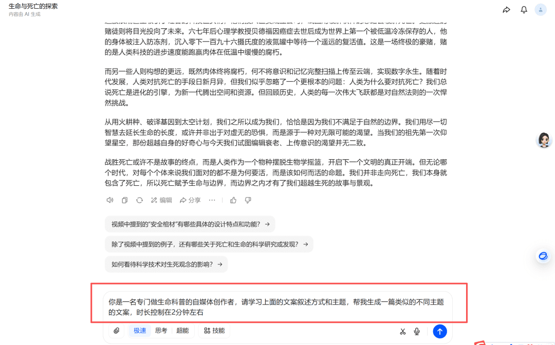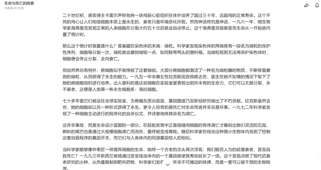 继续输入提示词:你是一名专门做生命科普的自媒体创作者,请学习上面的文案叙述方式和主题,帮我生成一篇类似的不同主题的文案,时长控制在2分钟左右