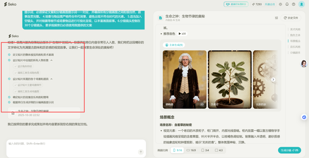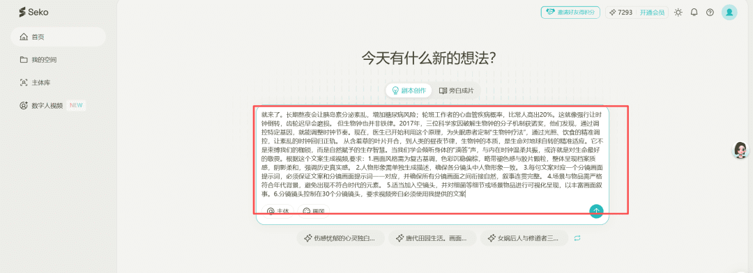 这边我选择使用seko来制作,原因主要是seko适当生成这种小短片,主要还是我积分多,再加上最近它集成了sora2模型,所有选择用它来生成作品
