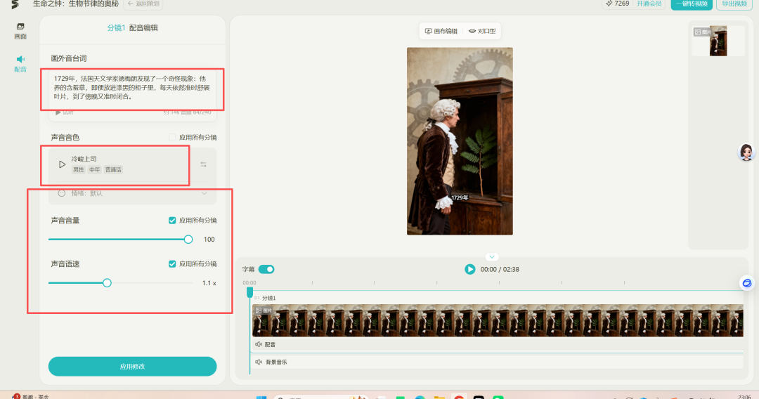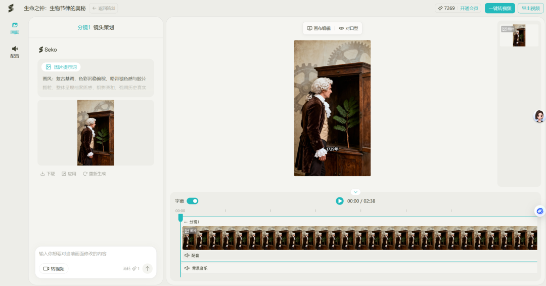 提炼短片所需的角色进行创建,然后根据文案拆解生成合适的分镜画面提示词,给出合适的音色和背景音乐,帮我们省掉了很多时间,比如还要去生成音频,然后拖入剪映剪辑的操作如果觉得生成有不合适的地方可以继续对话让它修改,没有就点击生成分镜