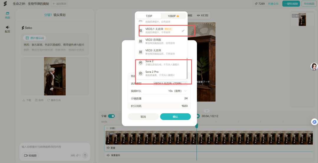 sora2和veo3.1模型都有,看自已积分来选择,我选择Veo3.1模型进行生成所有的分镜画面