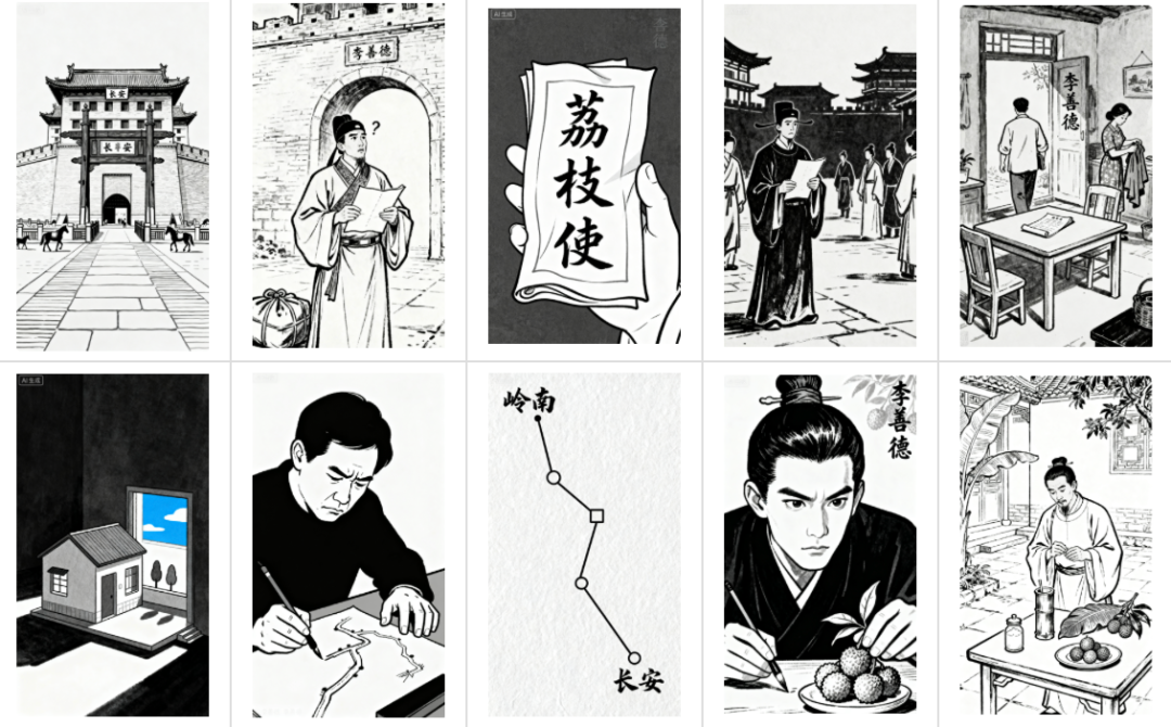 豆包一次只能生成10张图片,我们总共有40个分镜头,只能分四批生成。下面看看豆包给我们生成的图片如下: