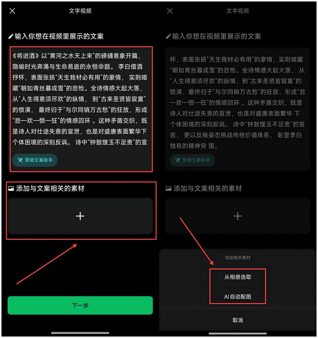把文案复制进去,再添加素材。我这里选择用AI自动配图,如果你有更好看、更适合的素材也可以选择从相册选取;
