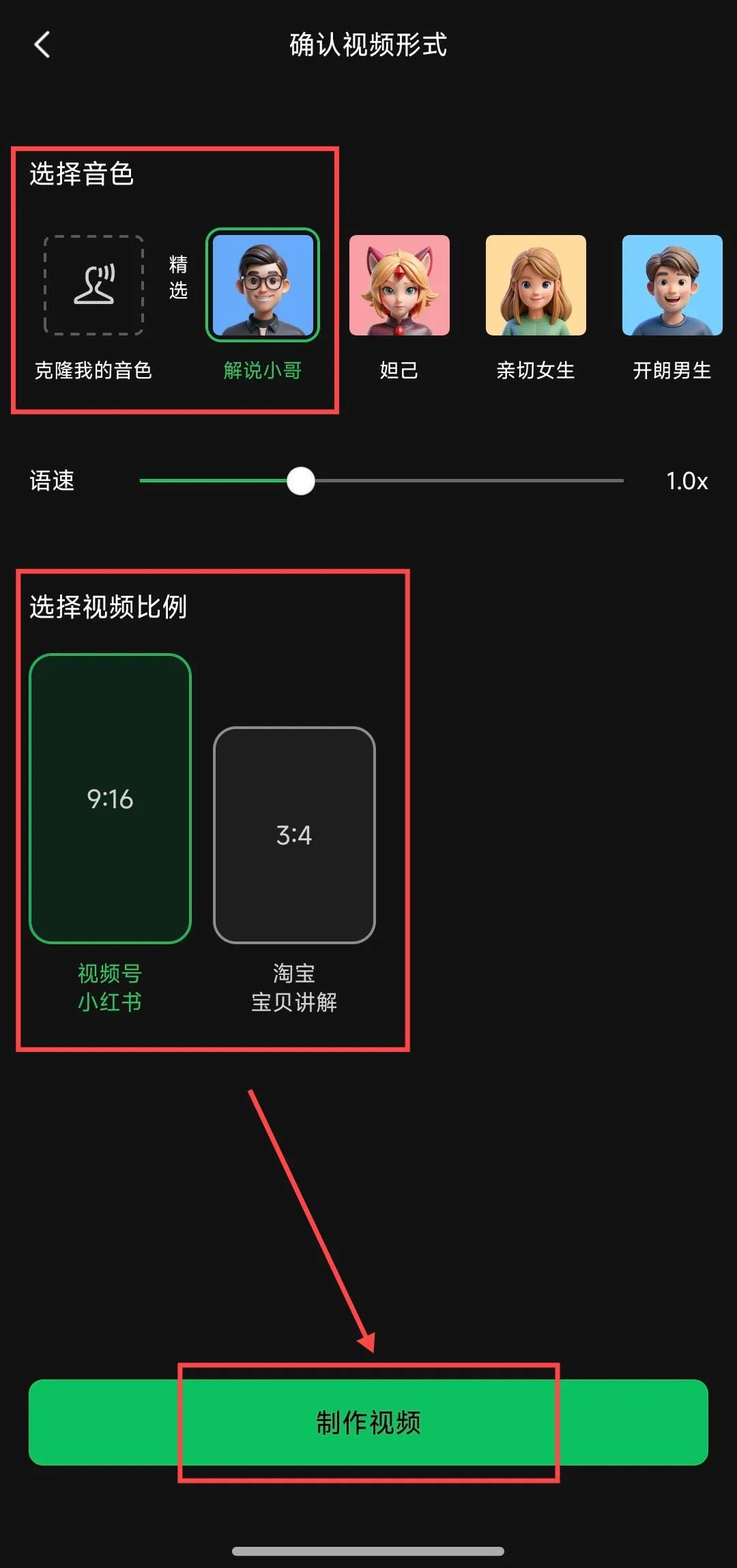 再选择配音音色,然后视频比例选择9:16,最后点击制作视频;