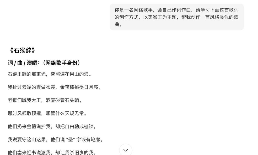 | 你是一名网络歌手,会自己作词作曲,请学习下面这首歌词的创作方式,以美猴王为主题,帮我创作一首风格类似的歌曲。 |