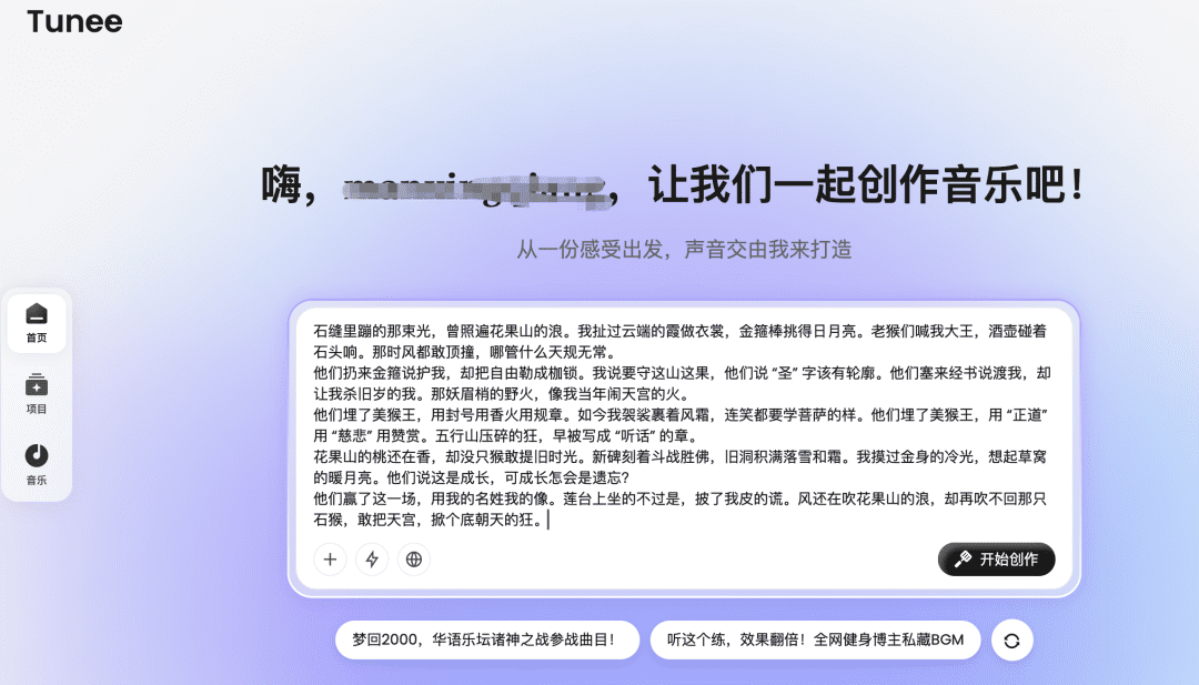 第二步:生成歌曲 今天给大家介绍一个可以为你创作歌曲的网站(Tunee),我下面这首歌就是在这上面创作的,非常简单好用,而且每天送积分,基本可以满足我们的需要。 网址如下:https://www.tunee.ai/zh-CN/home 我们将刚才让豆包生成的歌词扔给tunee,直接点击开始创作。