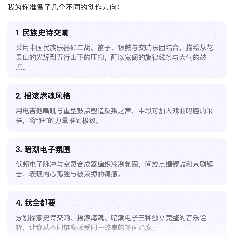 等待几秒钟,tunee就会帮我们分析我们的歌词和风格,还会给我们提供一些参考意见,最终给我们提供四种风格选择。大家可以根据自己的需要选择合适的创作方向。