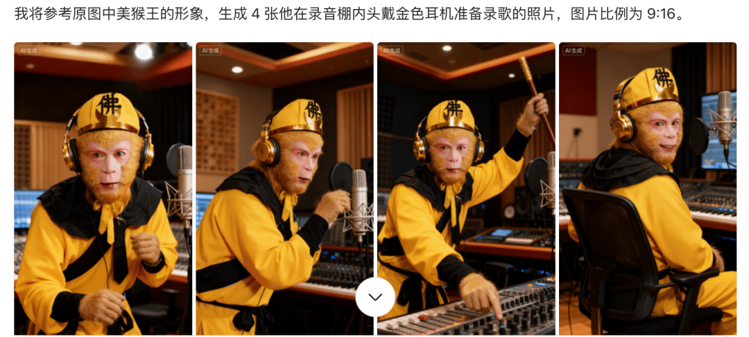 我选择了第二个,摇滚燃魂风格,直接点击选项,tunee很快就可以帮我们生成两首歌,大家可以仔细听听这两首歌。如果感觉不合适,还可以继续让tunee继续给我们生成2首。 第三步:猴王对口型视频 前面的音乐准备好了,下面就是准备一张美猴王的照片,然后让我们的美猴王唱出他自己的歌,先去网络上找一张美猴王的美照,大家要找比较经典的,然后借助豆包给我们生成一张美猴王在录音棚录音的画面。输入如下指令: