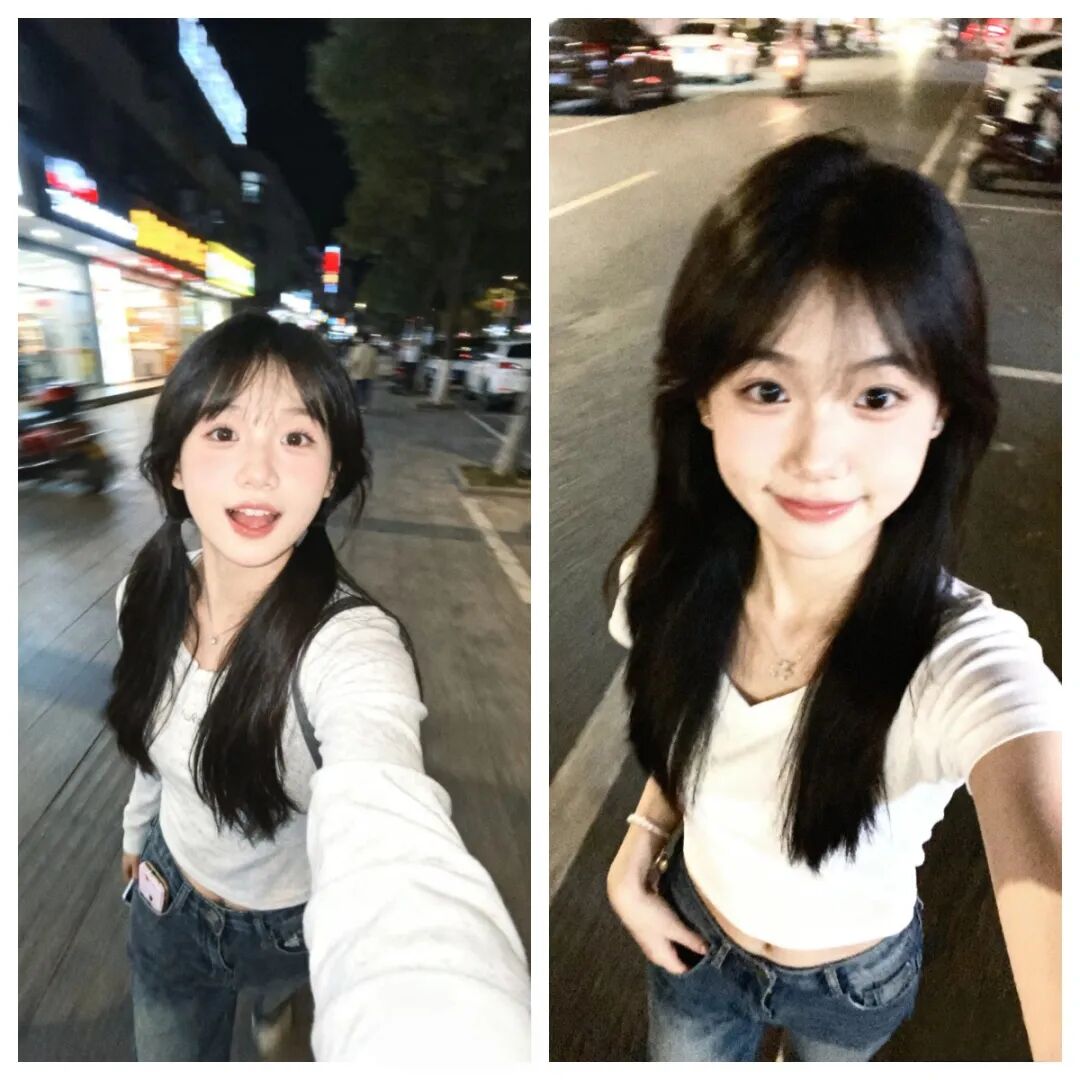 采用随手抓拍的快照风格,在街(自选)景里,一位黑长发少女出现在画面中。画面缺乏特定主体和构图美感,显得十分随意,照片存在运动模糊,灯光使画面轻微曝光过度,拍摄角度不佳,构图杂乱,好似从口袋拿手机时意外拍下的平庸自拍。比例1:1。