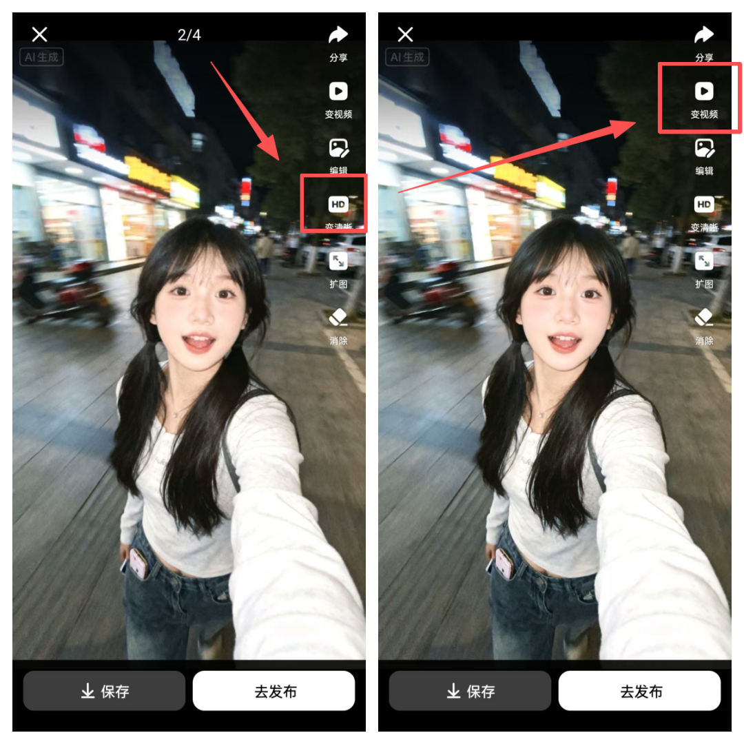 首先我们要把AI生成的图片转成视频,一定要先点变清晰,然后再点变视频,这样做出来的视频画面才更清晰。