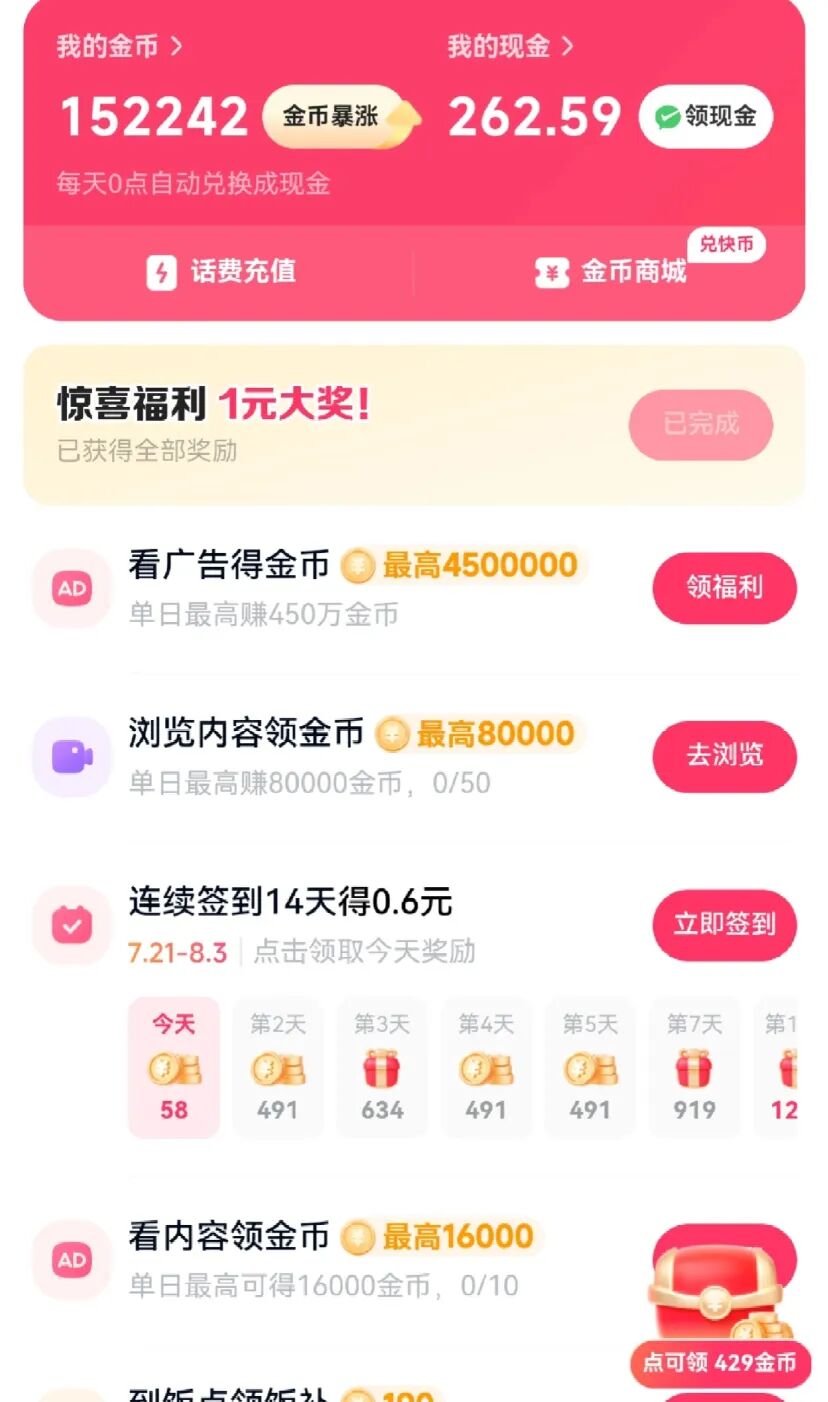 这类平台很多,比如快速极速版,抖音极速版,红果,番茄等等,每天刷刷,顺带賺点买菜钱