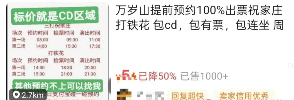比如在万岁山,王牌节目“打铁花”和“三打祝家庄”,就必须人到了园区内,才能用他们的官方程序预约,外面根本约不了。