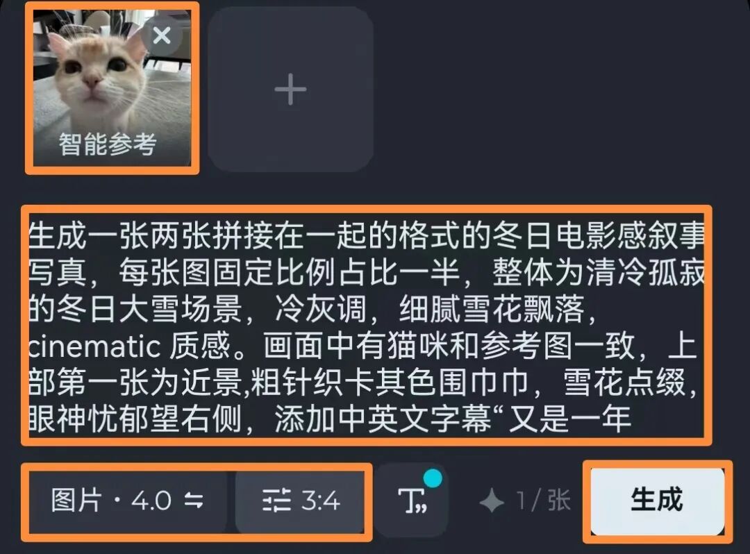 这个作品的难点其实就是,得会用抖音那个AI工具,还得准确选对猫咪、狗狗的模板,然后一步步操作生成同款冬日宠物写真,得保证画面风格和文字效果跟示例一样,对新手来说还是得摸索一下的。