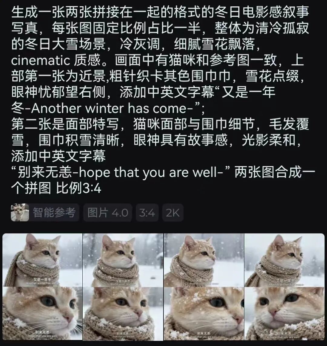 以宠物图片为蓝本,创作一幅上下拼接的冬日氛围叙事画面。整体采用冷灰影调,呈现雪日清冽孤寂之感,细雪纷飞,画面富有电影质感。上半部分为近景构图,宠物佩戴厚织黑色围巾,缀着点点落雪,目光忧郁望向画面右侧。配以文字:“又是一年冬—Another winter has come—”。下半部分转为面部特写,宠物凝望镜头,眼神朦胧而深邃,充足展现面部与围巾的织理细节。毛发间落满细雪,围巾上积雪可见,光影细腻柔和。搭配字幕:“别来无恙—hope that you are well—”。两幅画面以1:1比例垂直拼接,共同构成一个充满故事感的冬日写真。