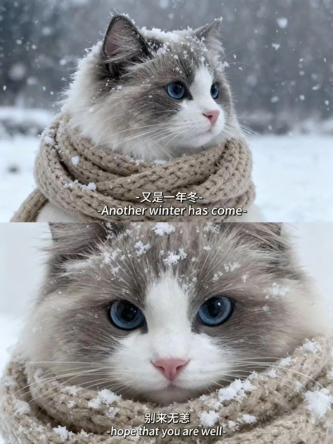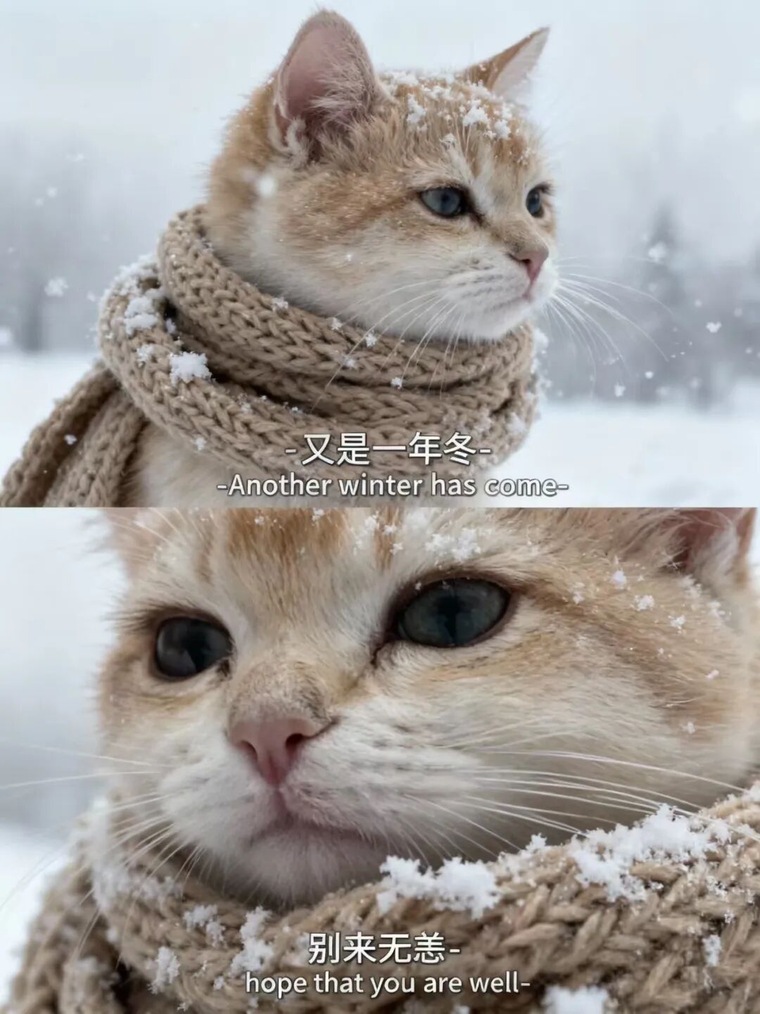 以图片猫咪为基础,生成一张上下拼接在一起的格式的冬日电影感叙事写真,每张图固定比例占比一半,整体为清冷孤寂的冬日大雪场景,冷灰调,细腻雪花飘落,具cinematic质感。上部第yi张为近景,图中猫咪围粗针织黑围巾,雪花点缀,眼神忧郁望右侧,添加中英文字幕“又是一年冬-Another winter has come-”;第二张是猫咪面部特写,猫咪正面对着镜头,眼神朦胧迷人,清晰展现宠物面部与围巾细节,毛发覆雪,围巾积雪清晰,眼神富有故事感,光影柔和,添加中英文字幕“别来无恙-hope that you are well-” 两张图合成一个拼图。 高清写真。