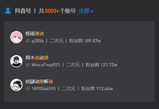 目前,该类型播放账号的命名方式常常是“XX说漫”“XX说动漫”等。我在新抖数据搜索关键词“说漫”,搜索结果显示已经存在5000+相关账号,部分账号的粉丝数量过百万。