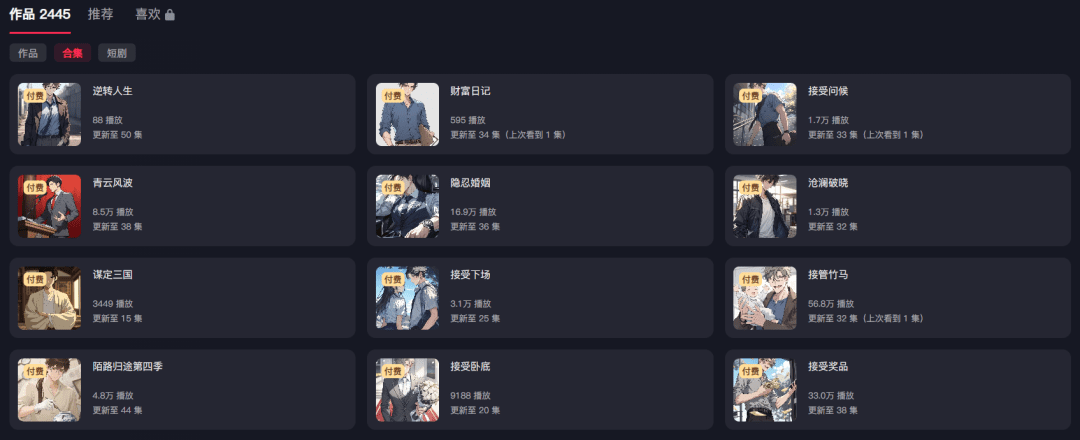 比如上述片段,来自抖音博主@顾解说 的合集《接受竹马》,目前更新至32集,包含29集付费,累计55.7万次播放。凭借这种“AI动画+旁白解说”的形式,该账号已经积累了21.3万粉丝。