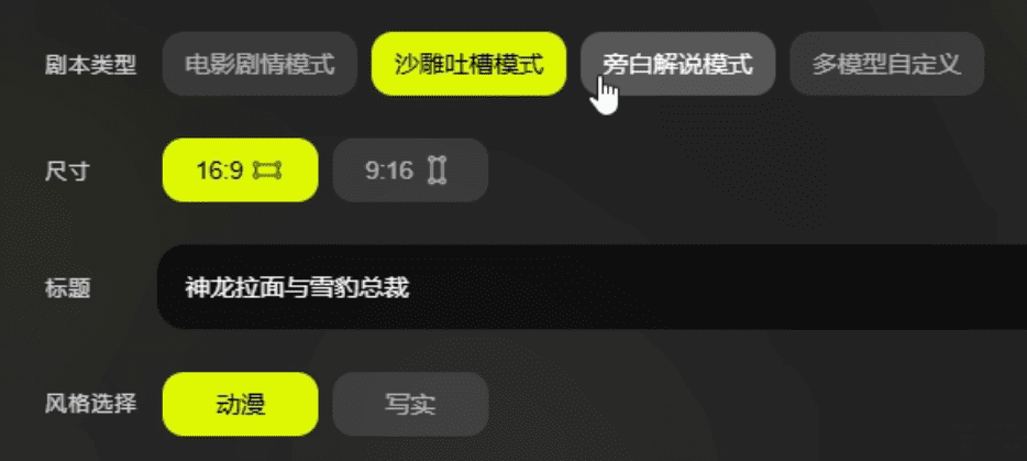 从“剧本策划”频道开始,就可以进入一键成片的流程——【沙雕剧本改编 → 智能分镜策划 → 风格化分镜生成 → 动态视频合成 → AI配音与音效 → 自动剪辑导出】。如果给AI提供成熟剧本,在“旁白主导模式”下可以自动匹配相应的旁白文案,并直接执行分镜策划开始的后续制作环节。