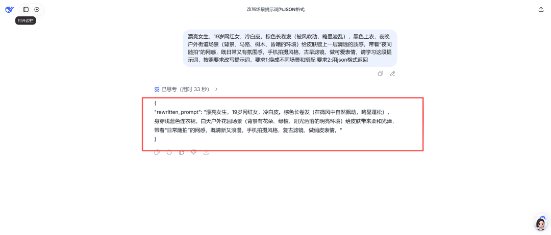 操作deepseek进行生提示词,核心主要是借助魔法指令来完成提示词输入和输出处理,为了方便大家进行解析文案,教大家一个小技巧,让它用json串来输出,提取超级方便