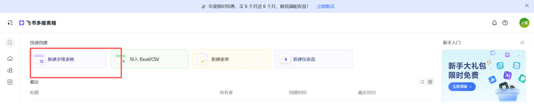 2.打开飞书多维表格网址:https://icn7hj66zbgu.feishu.cn/base用手机号码注册,进入点击创建多维表格