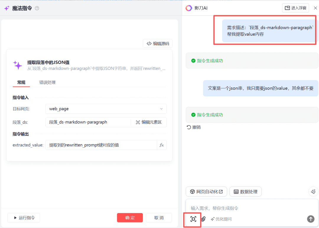 魔法指令的使用也非常简单,只需要点击捕获需要操作的范围,输入指令就可以,这个就和AI对应一样,没什么难度