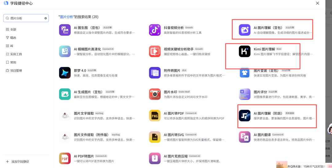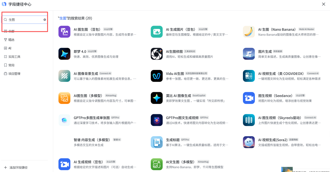 我的构思是这样子,输入提示词,AI根据提示词进行生图,借助豆包的视觉模型进行分析图片,根据图片内容生成图生视频提示词,最后借助豆包来进行图生视频。文生图怎么设置呢?选择这一列,点击修改字段,点击字段类型,选择字段捷径中心