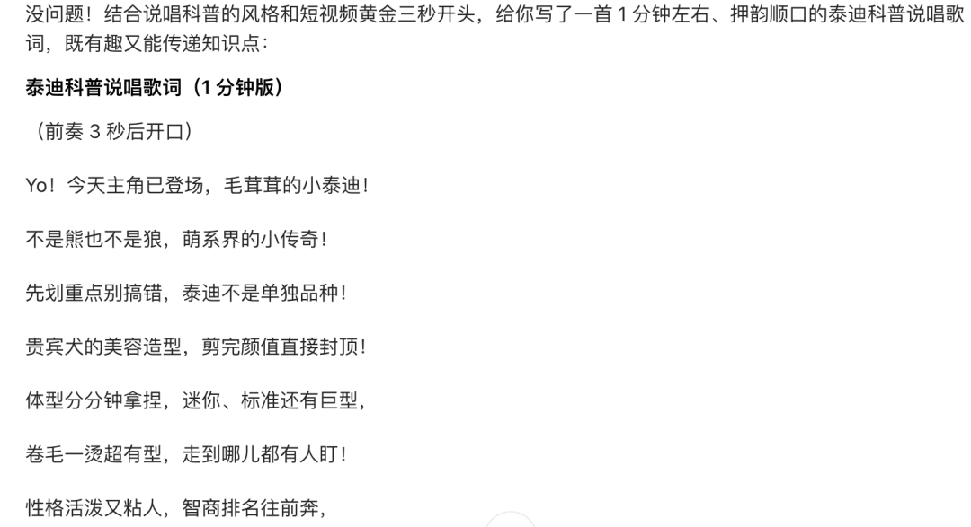 下面就带大家来看看这类视频是如何制作的。 第一步:生成动植物科普歌词 现在的AI工具还是非常的多,比如豆包、deepseek、chatgpt等,不过我使用了那么多公斤,感觉还是豆包的效果更好,所以我每次写教程都是用豆包,今天也不例外。今天我就以“泰迪”为例,给大家讲解如何制作类似视频,输入如下提示词: