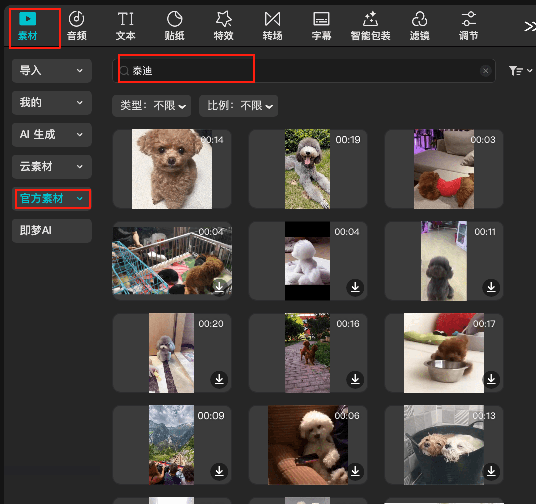 第二种:借助强大的互联网,去网上搜索素材,我喜欢在小某书找素材; 第三种:我们还可以利用剪映自带的强大的素材库,比如你点击“素材”-“官方素材”-搜索“泰迪”,如下图所示: