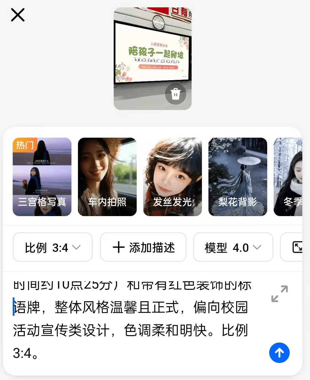 复制上面的提示词,豆包选择AI创作,上传同行的那张参考图,比例选择3:4,然后点生成即可。