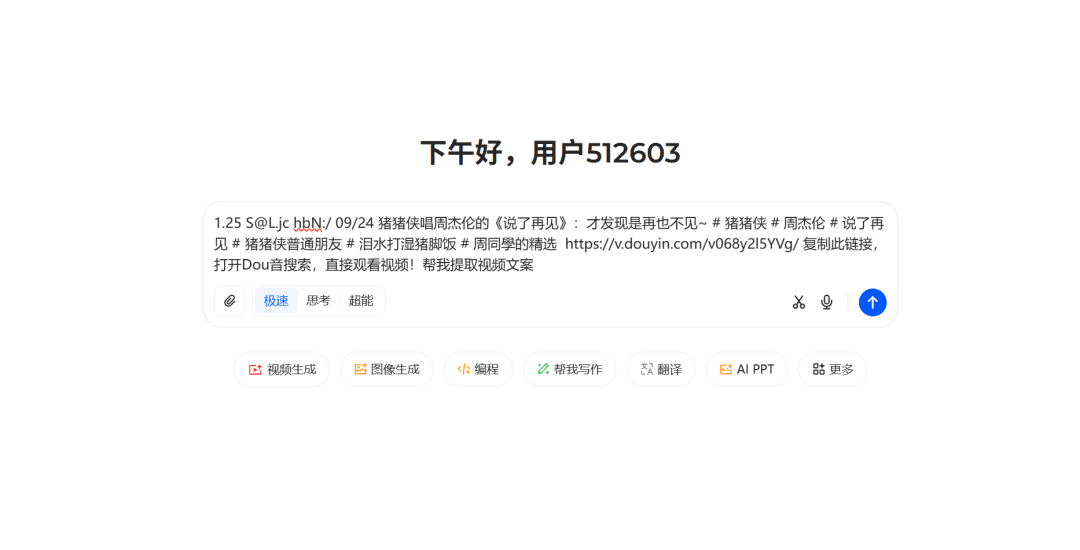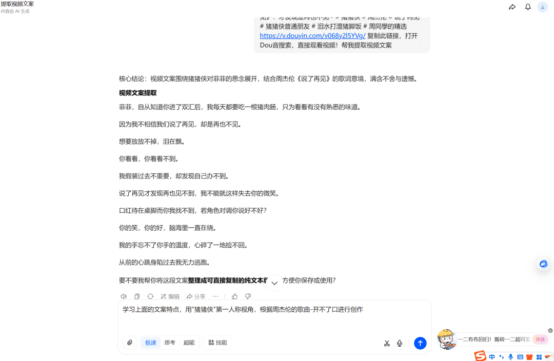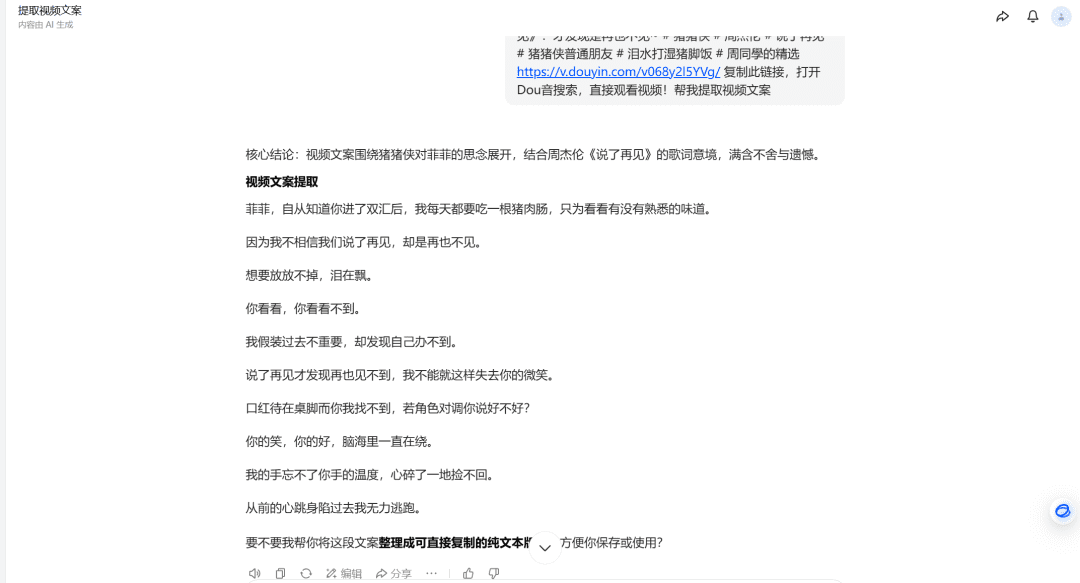 1.歌词生成提示词生成常用kimi、deepseek、claude、chatgpt或者豆包等等工具进行生成,这边我使用deepseek网址:https://www.doubao.com/chat/输入对标视频链接让豆包帮我们提取视频歌词