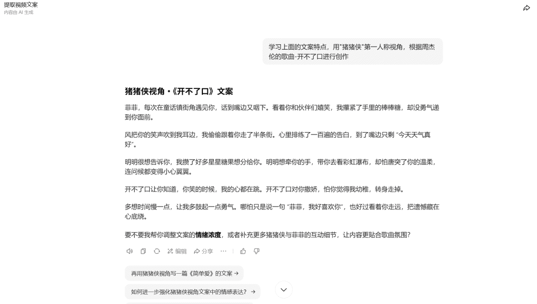 输入提示词:学习上面的文案特点,用”猪猪侠”第一人称视角,根据周杰伦的歌曲-开不了口进行创作