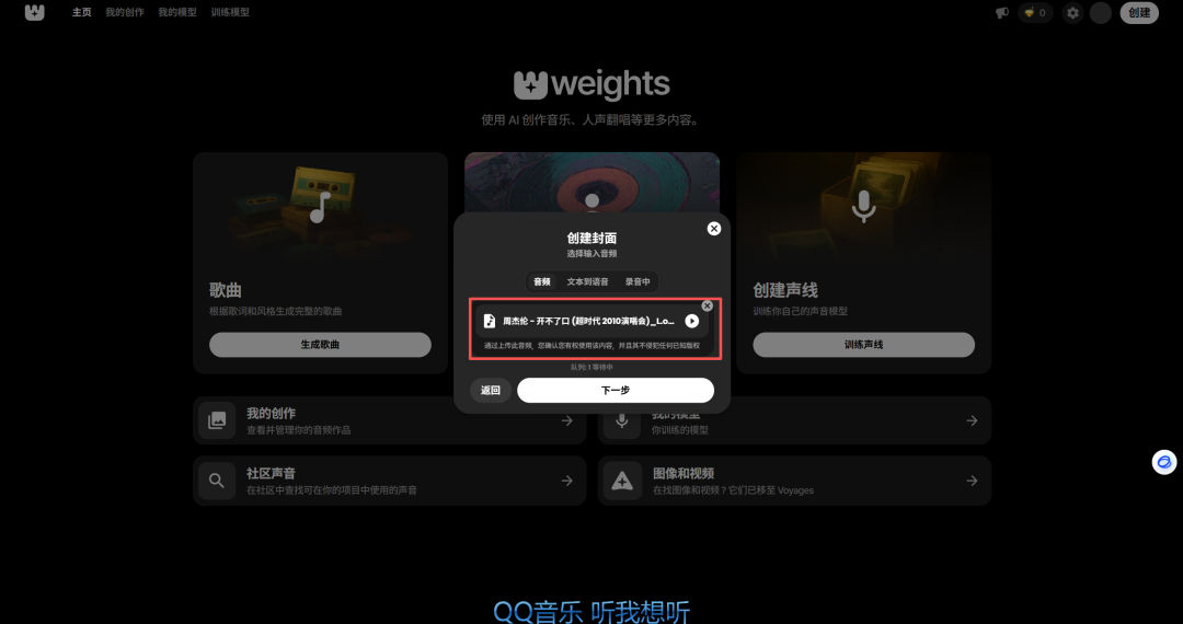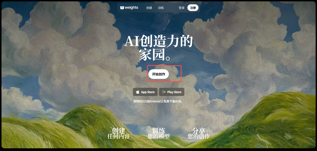 3.歌曲生成网址:https://www.weights.com(需要魔法)进入首页,点击开始创作