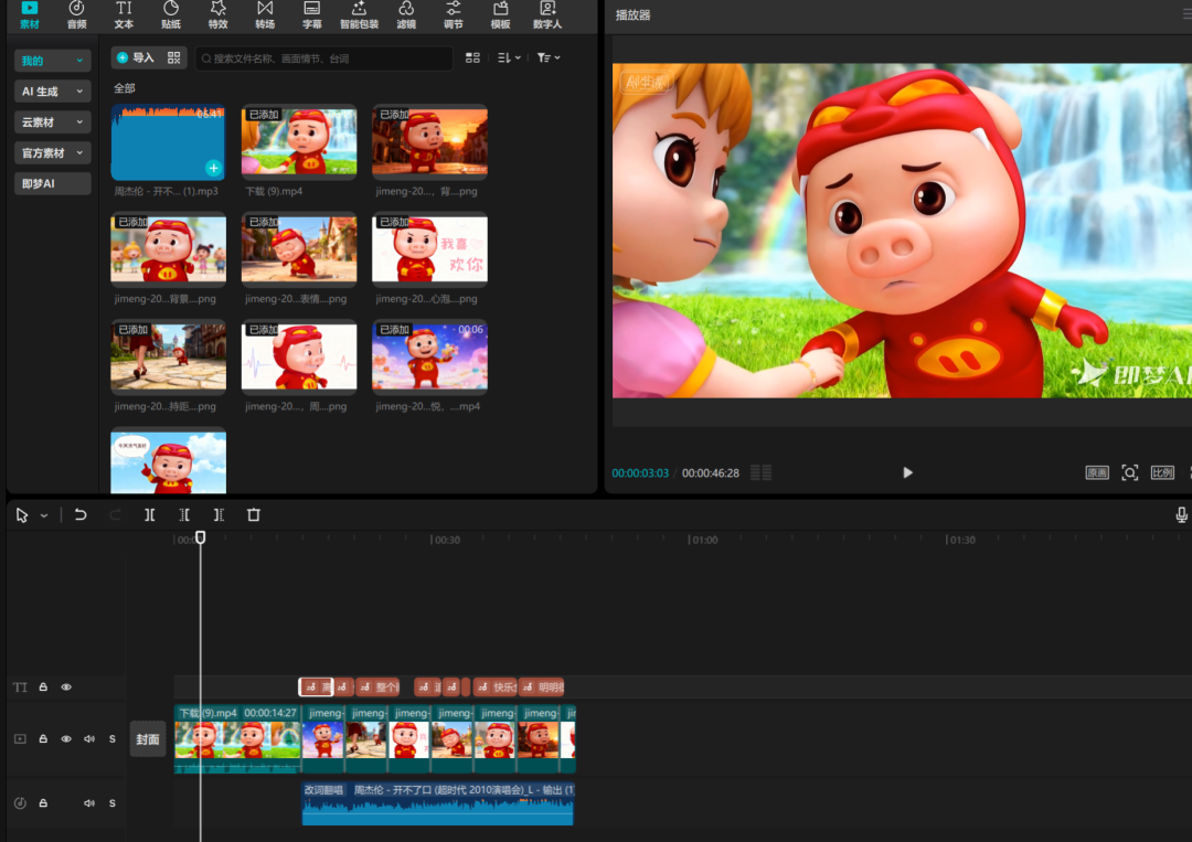 5.剪辑成片下载所有的视频画面拖入轨道,添加合适的转场,我这边积分用完了,后面就借助静态画面,大家做还是做成动态给视频添加歌词字幕,调整字幕的颜色和大小