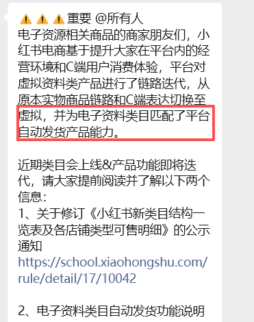 而且现在还有一个利好,就是最近小红书官方发了通知,平台已经可以支持自动发货了,就是说,我们卖虚拟资料,以后不用再另外一年花一两百买阿奇索和租服务器全自动了。