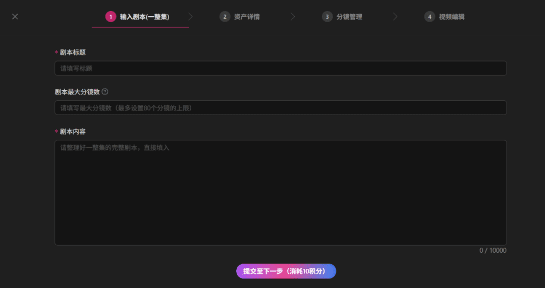 目前,我们在巨日禄Agent的界面可以看到,从输入一整集剧本的标题、内容、预设分镜数,到后续的创建资产、分镜管理、视频编辑,只需要不断“提交至下一步”,就可以让这位AI员工完成原本繁琐的工作。