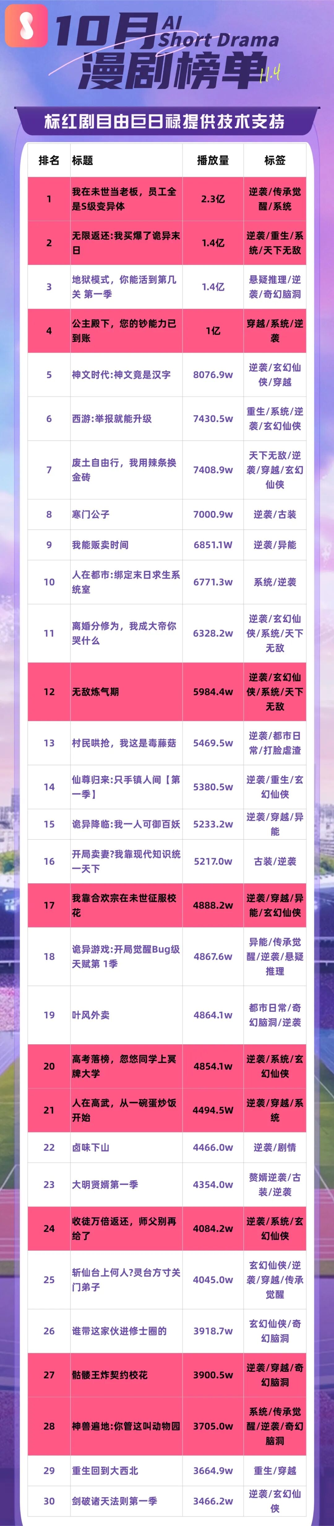 而在10月的漫剧榜单上,由巨日禄AI提供技术支持的漫剧作品在TOP30的中占比三分之一,《我在末世当老板,员工全是S级变异体》《无限返还:我买爆了诡异末日》包揽第一名和第二名,前者播放量已经突破2.5亿——这也是巨日禄Agent亮相的底气。