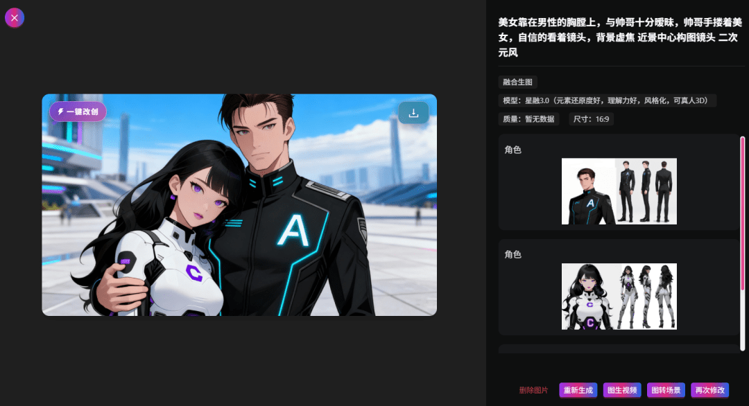 如果不满意生成的人物、场景、道具资产,点击“一键改创”就可以修改细节——对于有制作能力和经验的玩家来说,既省事,又有更高的创作自由度。