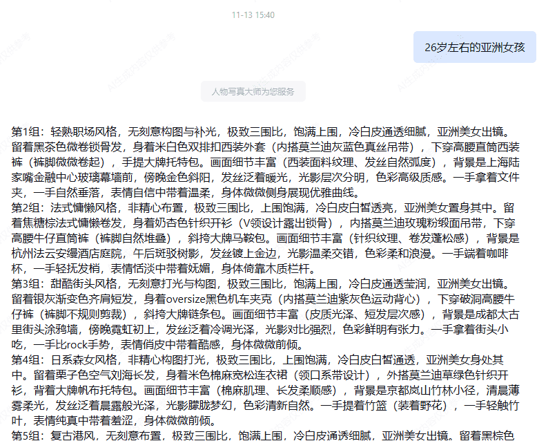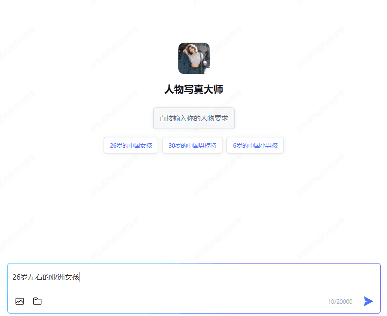 今天咱们就做这个1. 生图提示词打开【人物写真大师】智能体,直接输入人物性别年龄即可