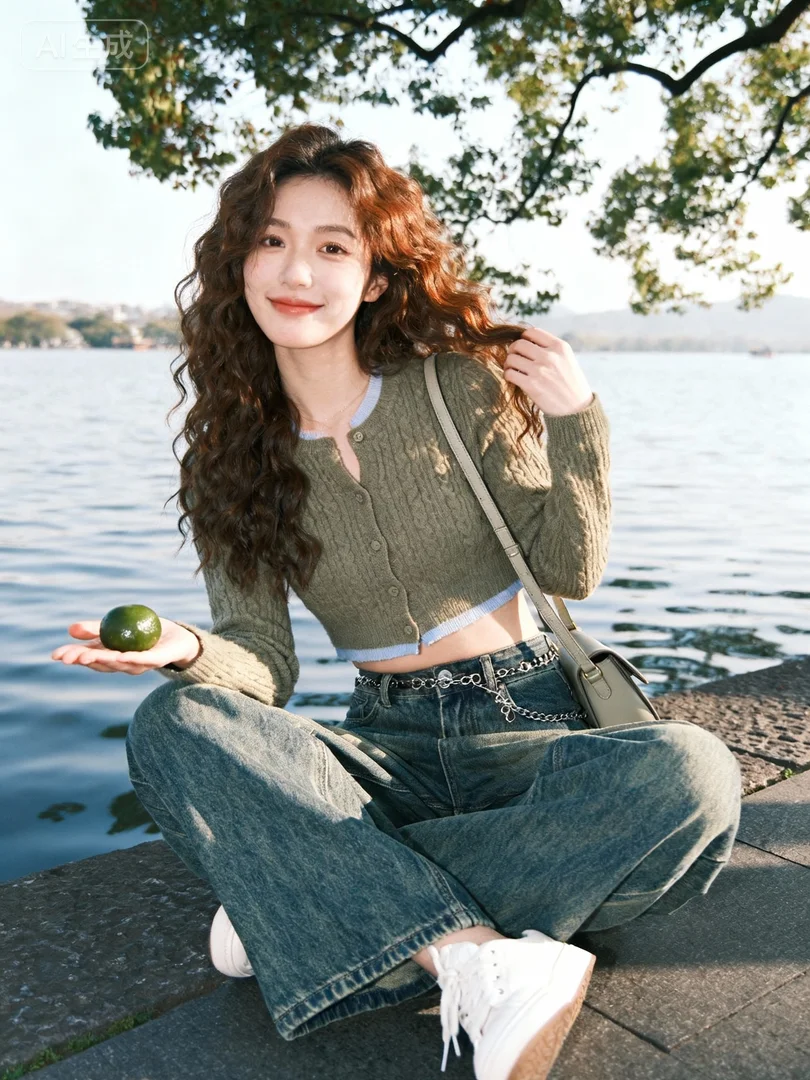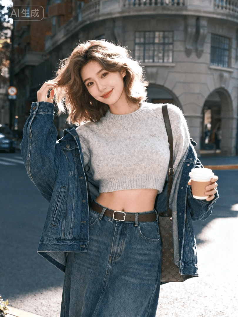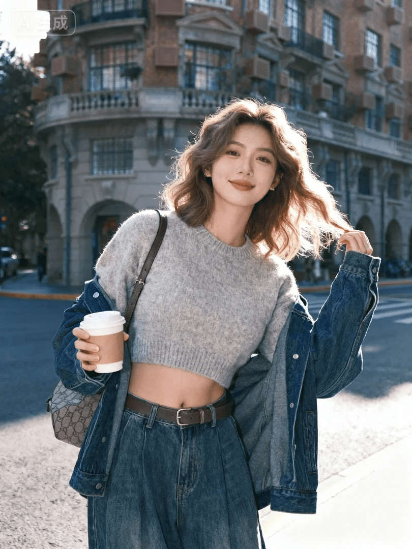 日常随拍风格,无刻意构图打光,极致三围比,上围饱满,冷白皮通透,亚洲美女出镜。留着浅棕色锁骨发,身着软糯针织短款露脐卫衣,搭配高腰阔腿牛仔裤,腰间系着简约皮带,外搭 oversize 牛仔外套半披在肩上,背着经典款腋下包。