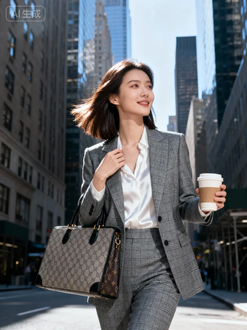 职场精英风格,日常快拍无刻意打光,极致三围比,上围饱满,冷白皮通透细腻,亚洲美女身处其中。留着深棕干练锁骨发,身着灰色格纹西装套装(内搭白色真丝衬衫),手提大牌公文包。