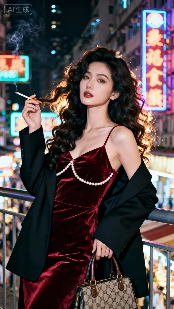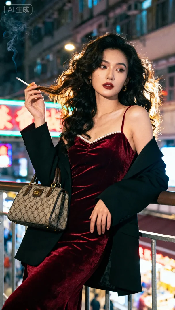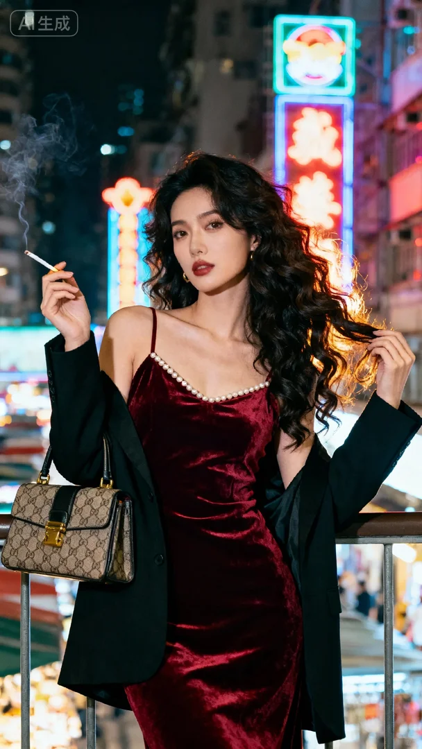 画面细节丰富(丝绒光泽、卷发弧度),背景是香港庙街夜市霓虹灯下,夜晚暖光交织,发丝泛着复古光晕,光影迷离梦幻,色彩浓郁饱满。一手夹着细长香烟道具,一手轻撩发丝,表情妩媚中带着神秘,身体倚靠栏杆微侧身。