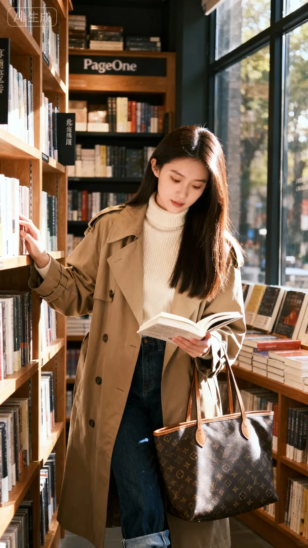 画面细节丰富(风衣褶皱、直发柔顺感),背景是北京Pageone书店书架前,午后阳光透过玻璃窗,发丝镀上知识的光晕,光影温暖静谧,色彩沉稳雅致。一手扶着书架,一手翻阅书籍,表情专注中带着温柔,身体微微前倾。
